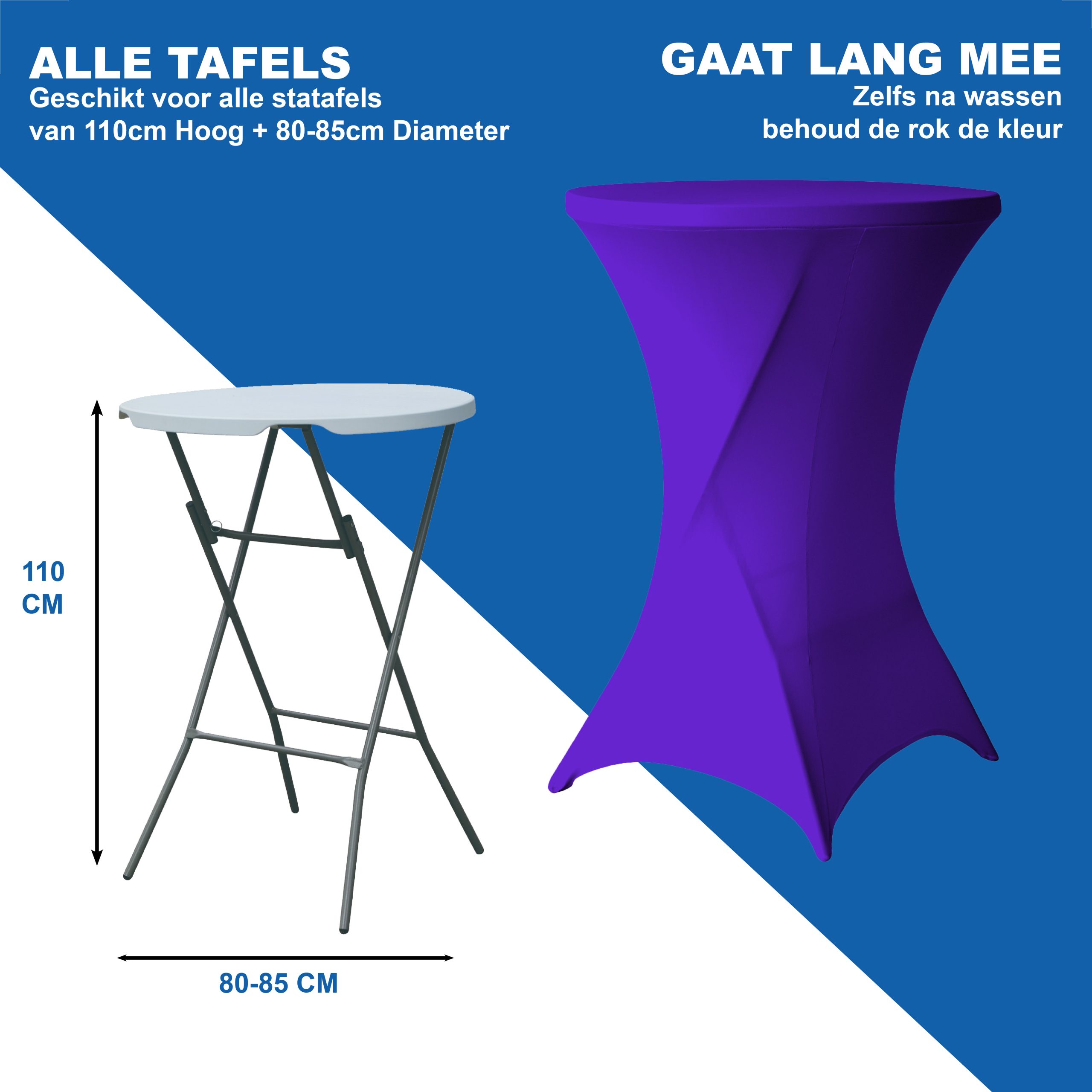 - Diameter: 80-85 cm, Hoogte: 110 cm. Ideaal voor standaard statafels.
