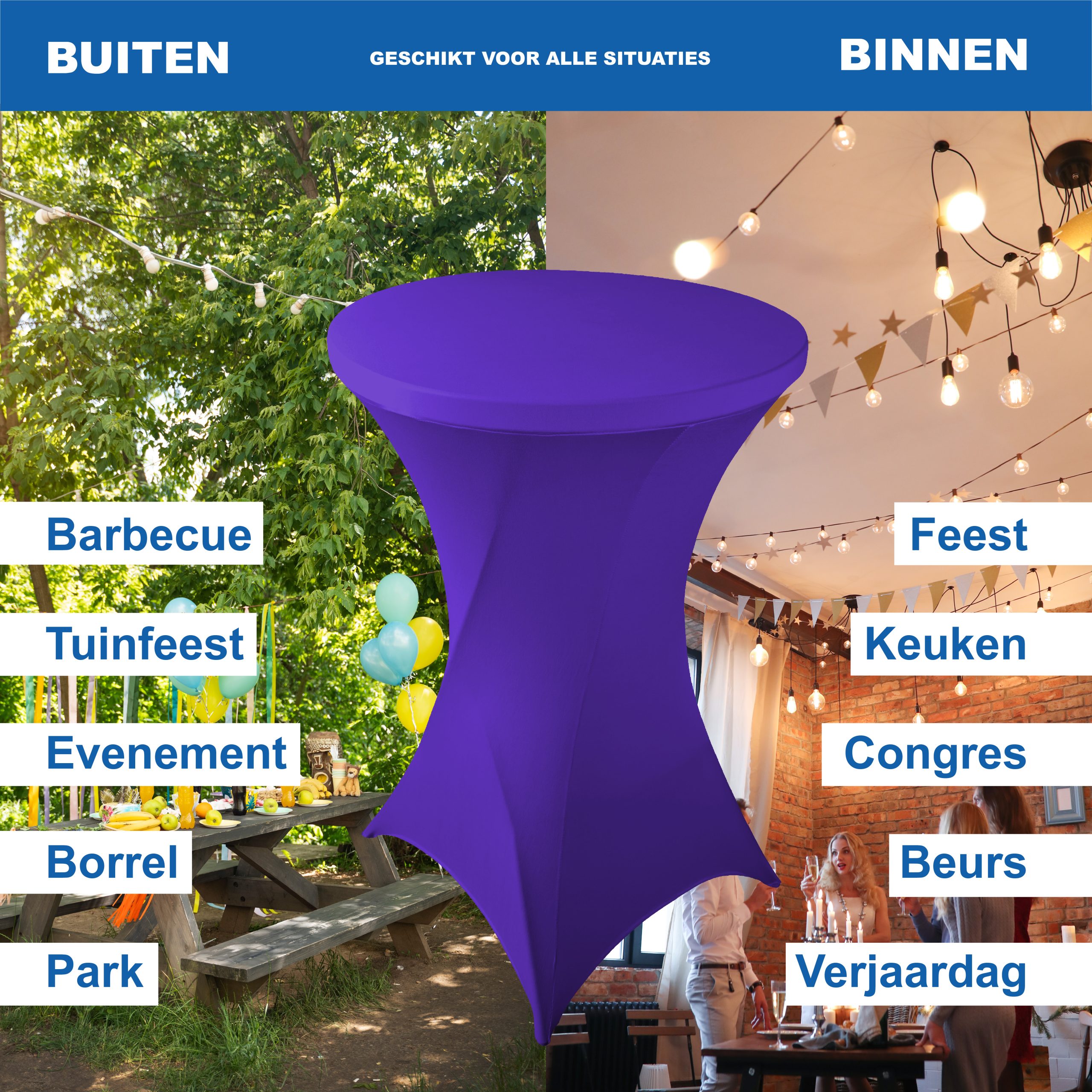 Op zoek naar paarse statafelrokken? Deze elegante statafelrok maakt jouw evenement helemaal compleet! Deze rok is gemaakt van een extra dikke stretchstof, is gemakkelijk te bevestigen en komt met een handige opbergtas, zodat je hem netjes kunt opbergen en vervoeren.